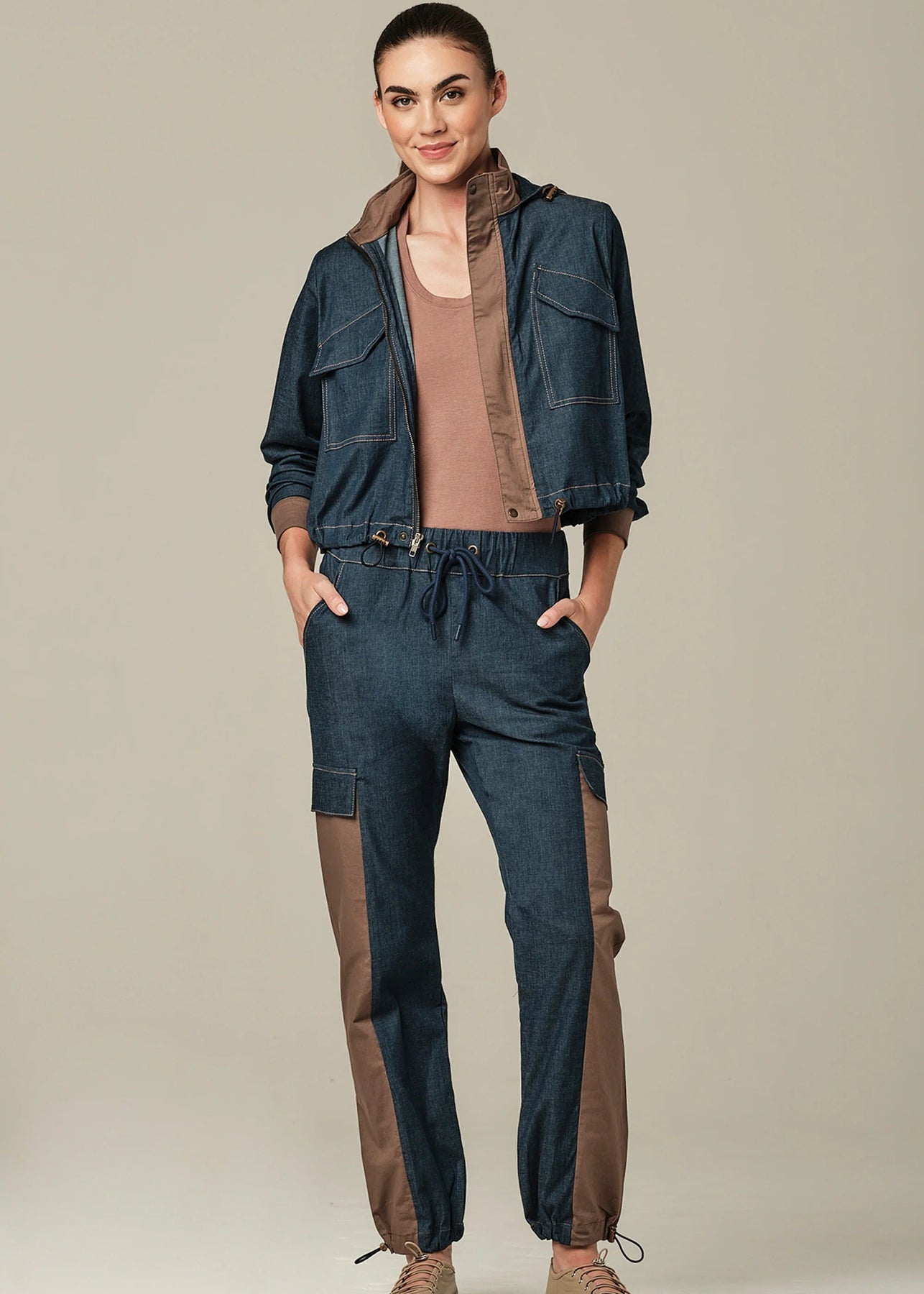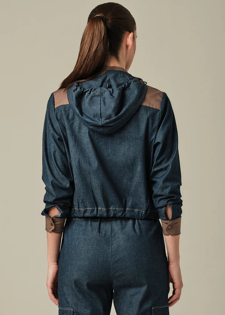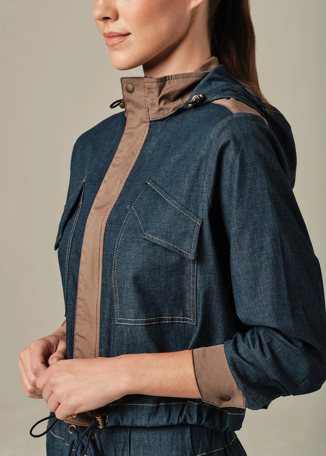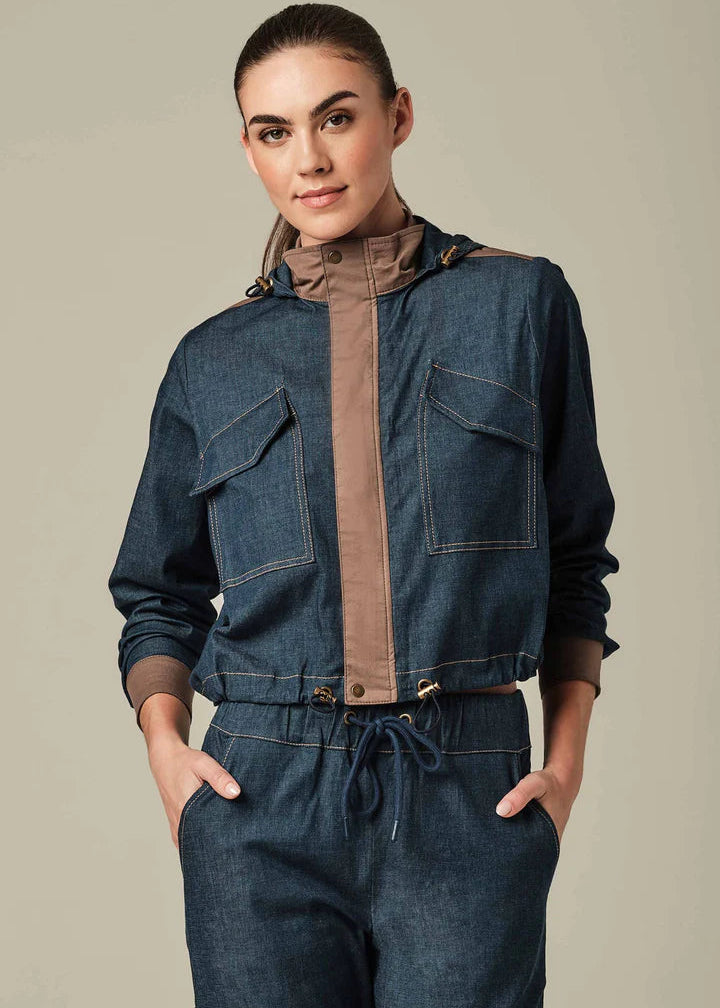 Experience unrestricted movement, come rain or shine. This jean jacket offers a flattering fit with stretch fabric that moves naturally with you. Its streamlined utility design includes double front pockets, an adjustable drawstring waist, and contrasting accents for a contemporary, adaptable style. Offered in Chestnut or Black, the jacket skillfully blends practicality and fashionโmade from high-quality stretch denim and protected by a waterproof coating to ensure comfort in all conditions. Key features include flexible stretch, a form-enhancing fit, and weather-resistant finish.