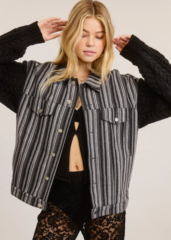 This sophisticated jacket combines contemporary design with functional details. The striking colorblock stripe pattern is complemented by textured cable-knit sleeves that add visual interest and dimension. A structured collar, polished metal buttons, and dual front pockets deliver both refinement and practicality. The relaxed, boxy silhouette offers an effortlessly chic aesthetic while ensuring comfortable everyday wear.