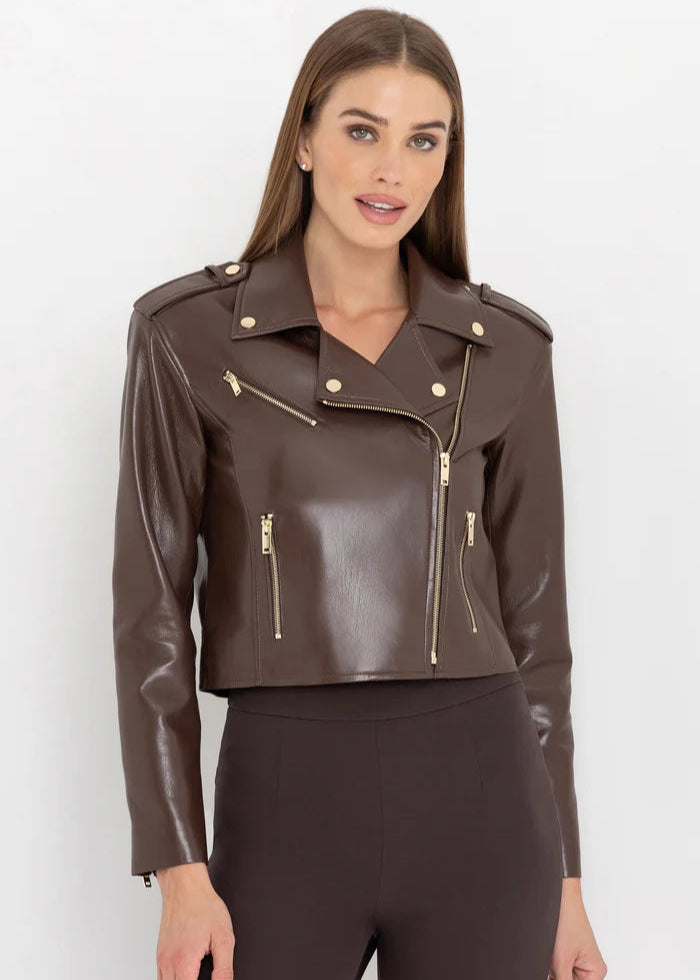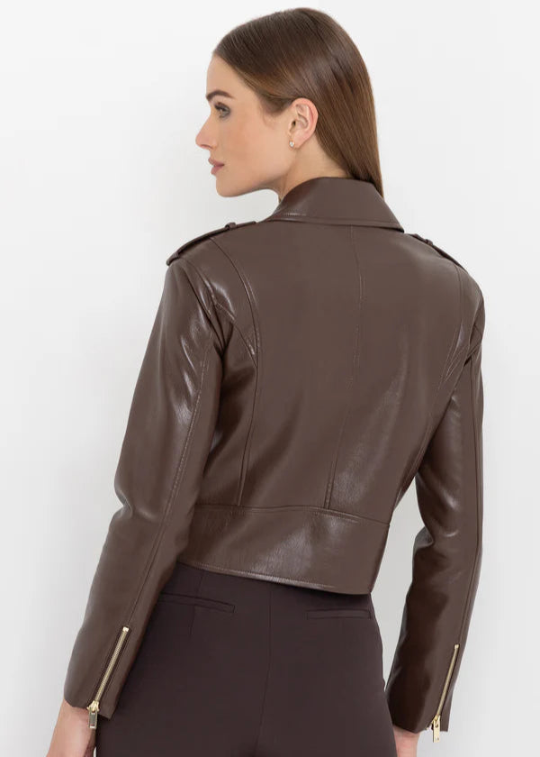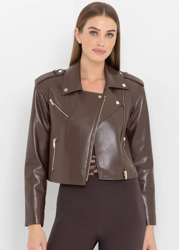 The Cosita Jacket offers a contemporary twist on a timeless design. Crafted from supple stretch vegan leather in a deep mahogany shade, it boasts a cropped, boyfriend silhouette with striking moto details. Enhanced by gold hardware on the asymmetric front, zippered cuffs, and slanted pockets, this piece elevates any look. Perfect layered over tees, dresses, or knits, it delivers sophisticated edge with effortless style.