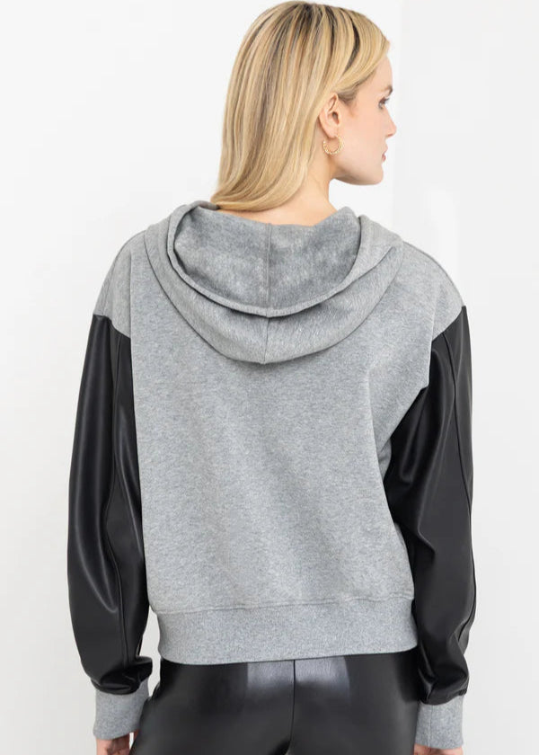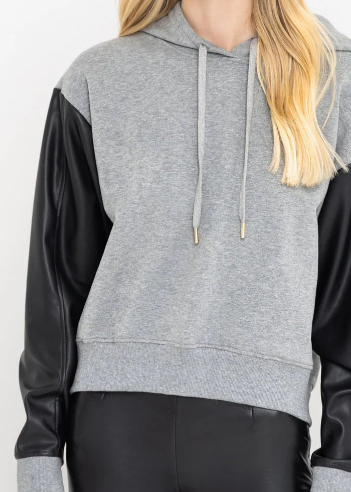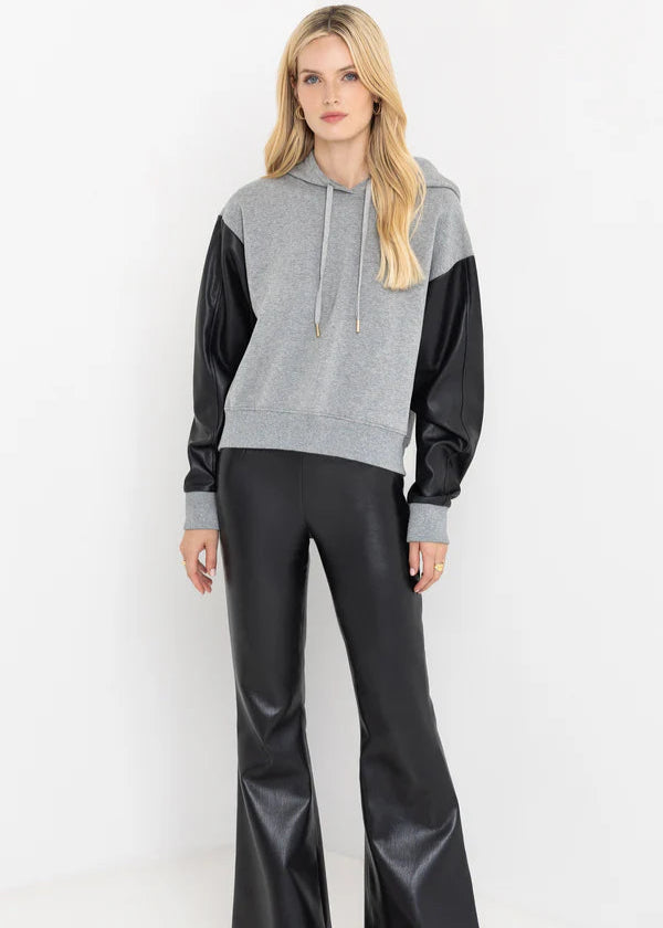 The Lisbet Hoodie redefines casual wear with a refined edge. Crafted from soft, brushed-back French terry and featuring contrasting vegan leather sleeves, this slightly cropped design blends urban style with sophistication. Its relaxed fit and adjustable hood ensure comfort, while the faux leather accents introduce a sleek, modern vibe. Ideal for pairing with denim, joggers, or vegan leather pants to complete a polished, street-smart look.