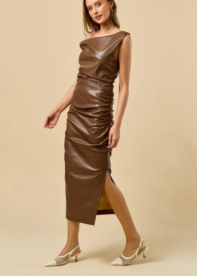 Make a striking impression in this faux leather midi dress, featuring an asymmetrical one-shoulder silhouette that delivers contemporary edge. The sleek PU construction creates a polished, high-impact aesthetic ideal for evening occasions and special events. Its midi length strikes the perfect balance between allure and refinement, offering versatility for those seeking a confident, fashion-forward statement piece.