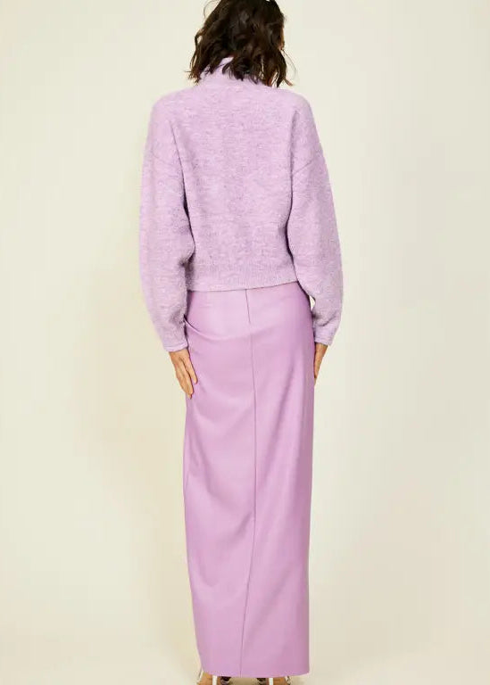 Maxi skirt featuring a striking twisted faux leather design with an elegant front opening. A bold statement piece that transitions seamlessly from day to night.