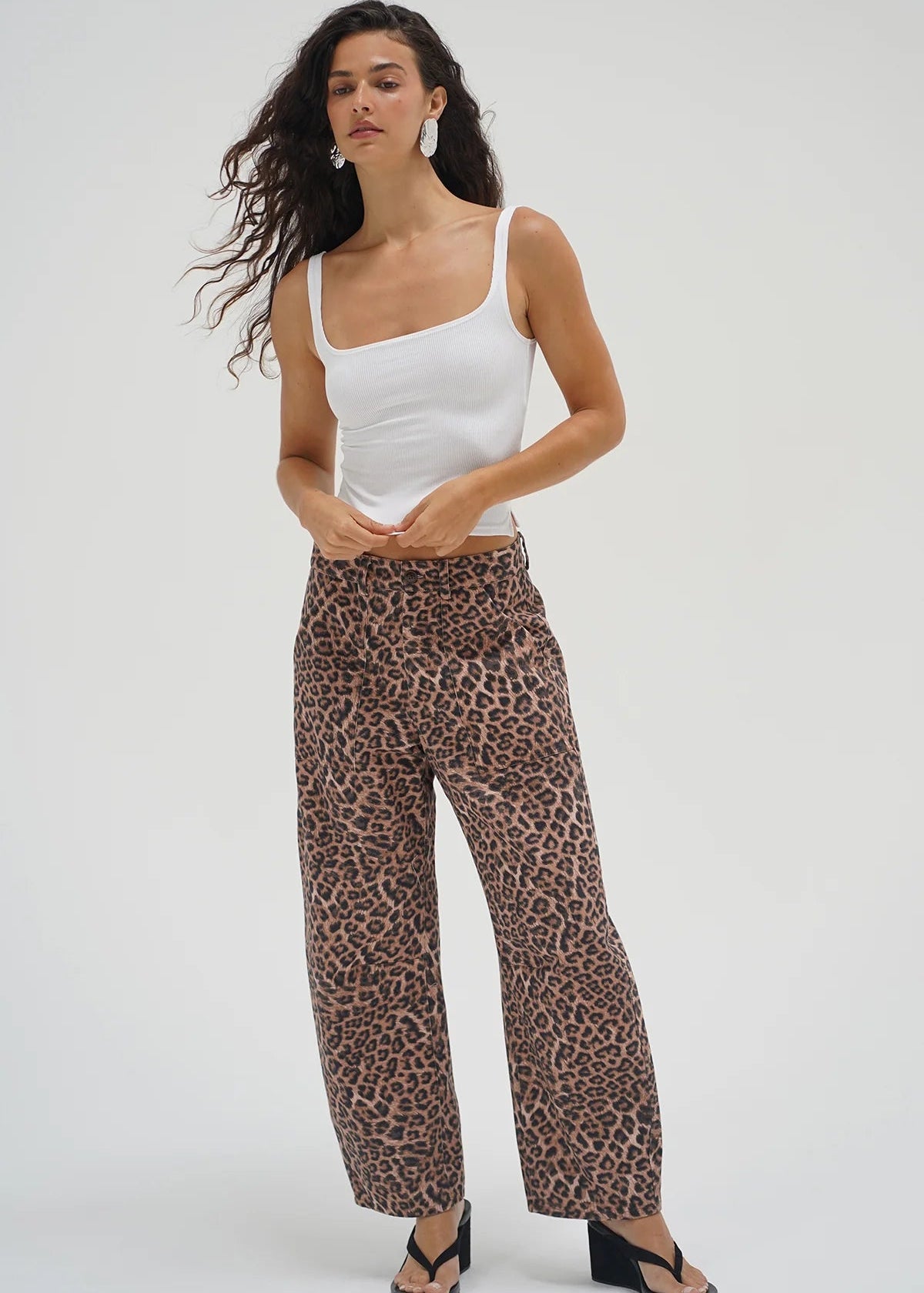 The Cross Creek Pant is back in a limited edition leopard print. Crafted from 100% cotton canvas, this barrel-leg pant features a zip front closure and pockets at both the front and back. For those between sizes, a smaller size is advised. The model stands 5'9" and is wearing a size small. Care instructions include machine washing in cold water on a gentle cycle and tumble drying on low. Designed in Los Angeles with imported fabric.