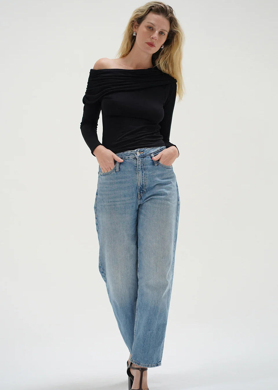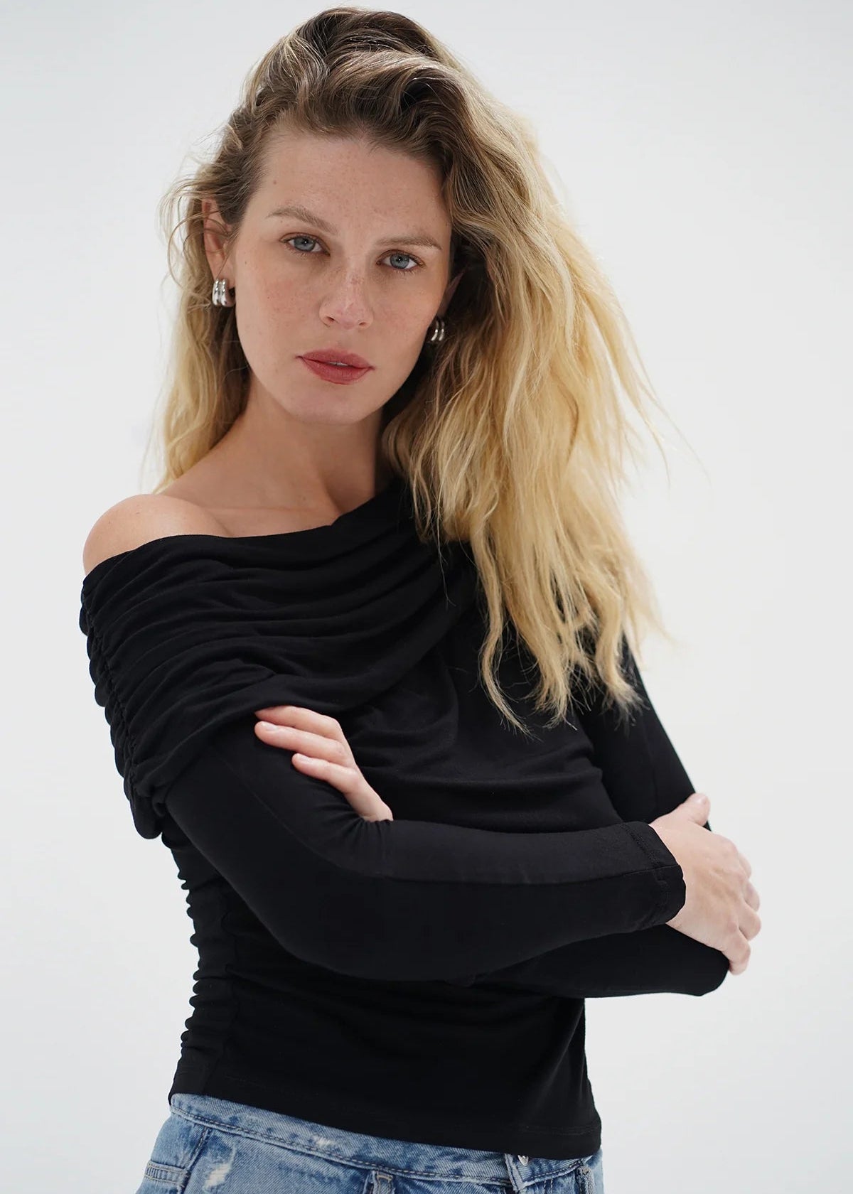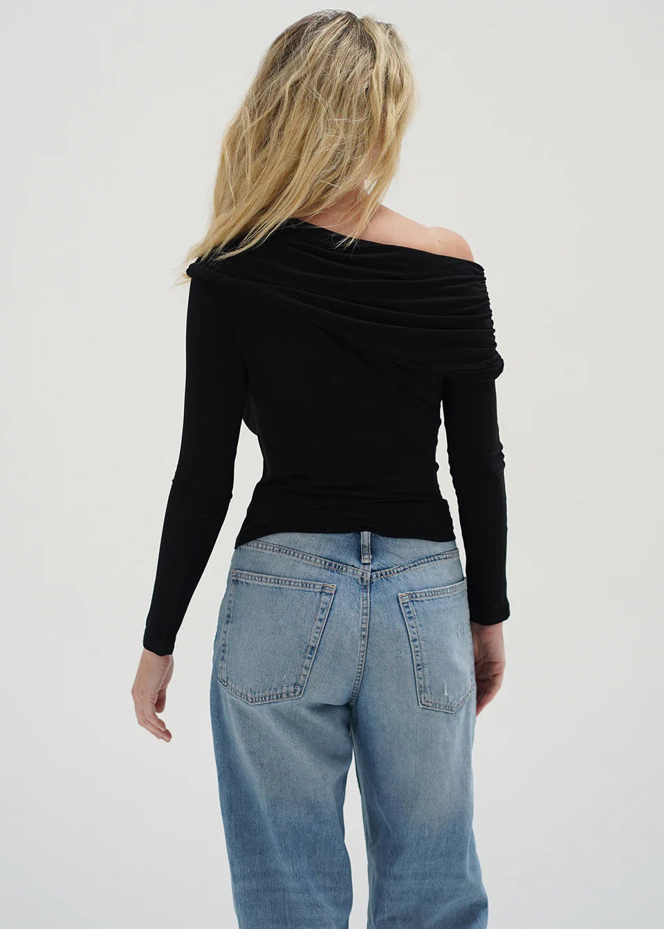 The Giselle features long sleeves and a fold-over neckline, designed to be styled off the shoulder for a versatile look. Crafted from a spandex jersey blend, it offers both comfort and stretch. The model, standing at 5'9", is shown wearing a size Small. Composition: 94% Rayon, 6% Spandex. Care instructions include machine washing cold on a gentle cycle and tumble drying on low. Designed in Los Angeles with imported fabric.