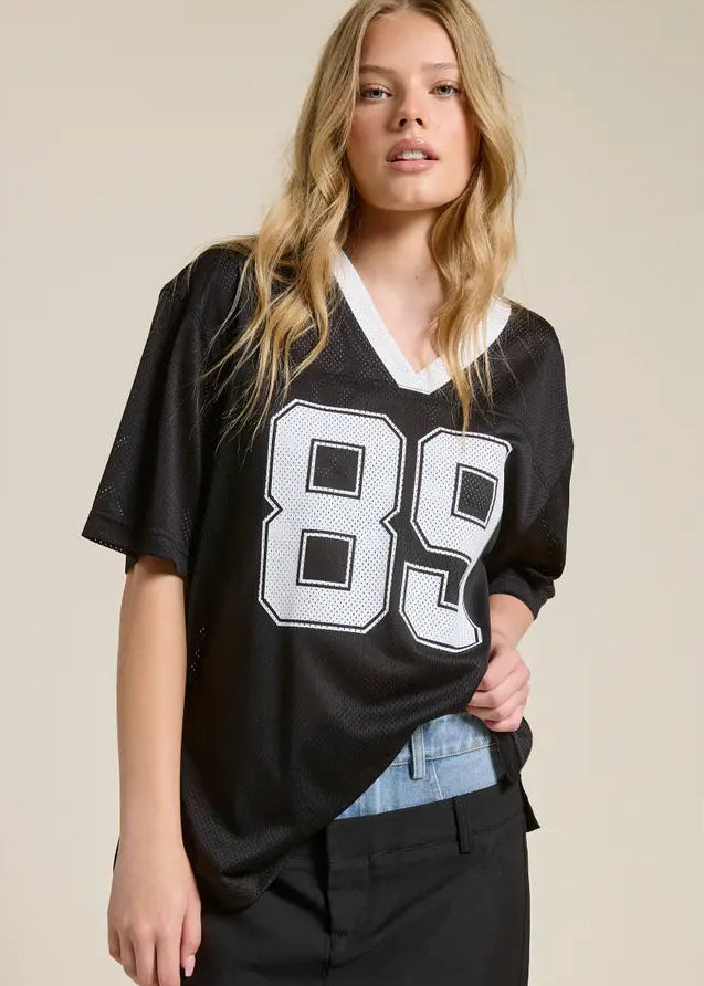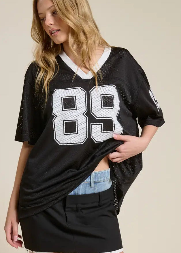 This versatile jersey top combines athletic styling with contemporary design. Featuring a classic V-neck silhouette and bold "89" lettering across the front and left sleeve, it delivers that coveted sporty aesthetic. The oversized cut provides comfortable movement and a relaxed fit ideal for casual wear. Crafted from 100% polyester for durability and easy care, this piece maintains its shape wash after wash. Hand wash recommended to preserve fabric integrity and print quality.
