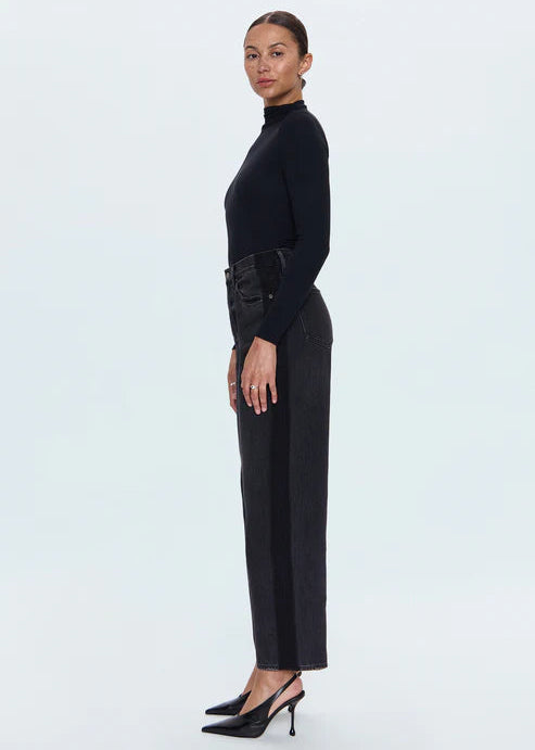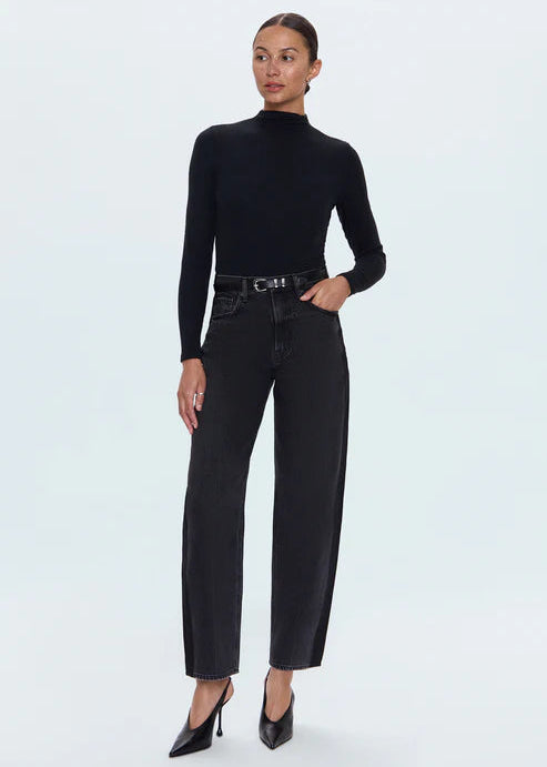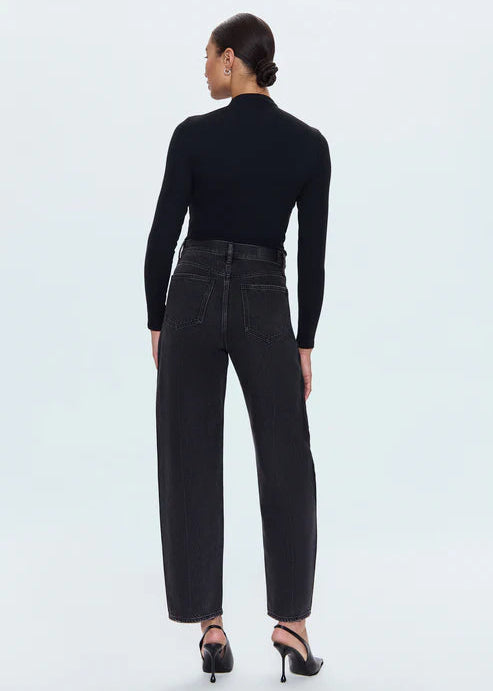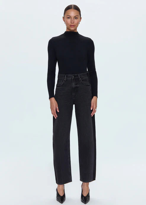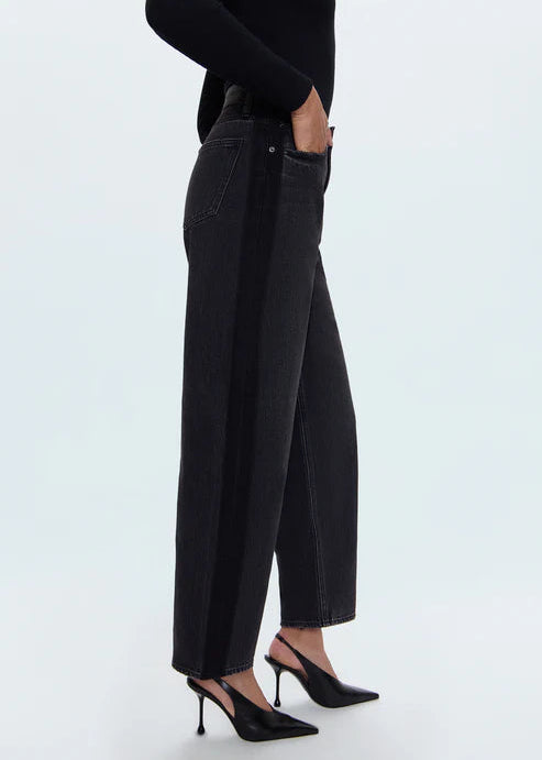 The Wes silhouette stands out as a customer favorite, featuring a commanding high rise paired with a dramatic barrel leg that commands attention. This 30" full-length style balances boldness with refinement through crisp hem finishing and a subtle tuxedo stripe accent. Crafted from premium rigid denim in Cinema—a deep black wash—this piece offers timeless sophistication and exceptional versatility for any wardrobe. The structured, non-stretch fabric ensures a polished appearance that only improves with wear.