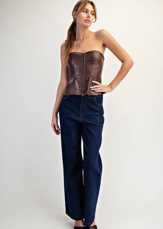 This bandeau peplum top combines contemporary edge with timeless sophistication. Crafted from supple faux leather, it features strategic panel seaming that creates a sculpted silhouette while maintaining wearability. The exposed front zip closure serves as both functional fastening and design statement, while the gently flared peplum hem adds feminine movement to the structured silhouette. Fully lined for comfort and security, the strapless design offers versatile stylingโdress it up for evening occasions or layer it for bold daytime impact. Whether paired with tailored trousers or flowing skirts, this piece delivers polished, fashion-forward appeal with an undeniable modern edge.