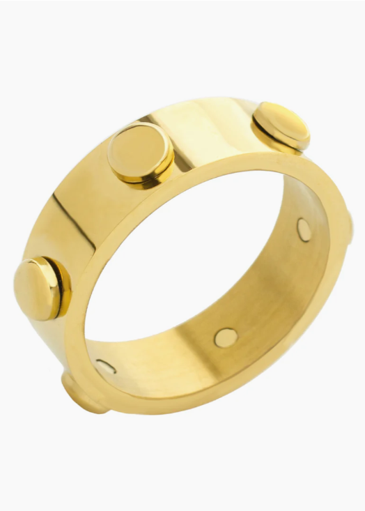 Crafted from stainless steel and coated with 18k gold plating, this ring is hypoallergenic and resistant to tarnishing