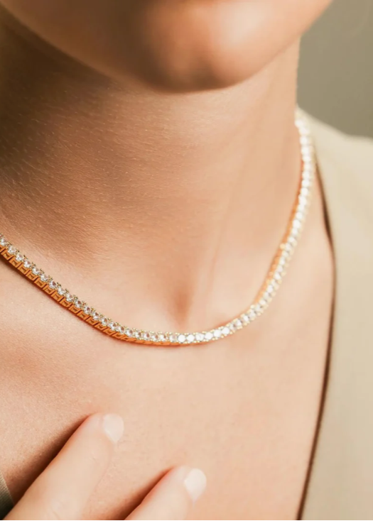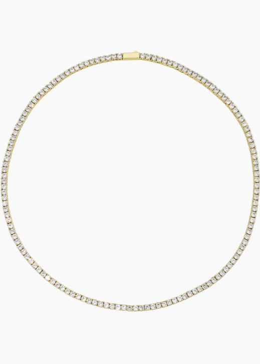 This 16" necklace features gold-plated brass accented with cubic zirconia, designed to resist tarnishing for long-lasting elegance.