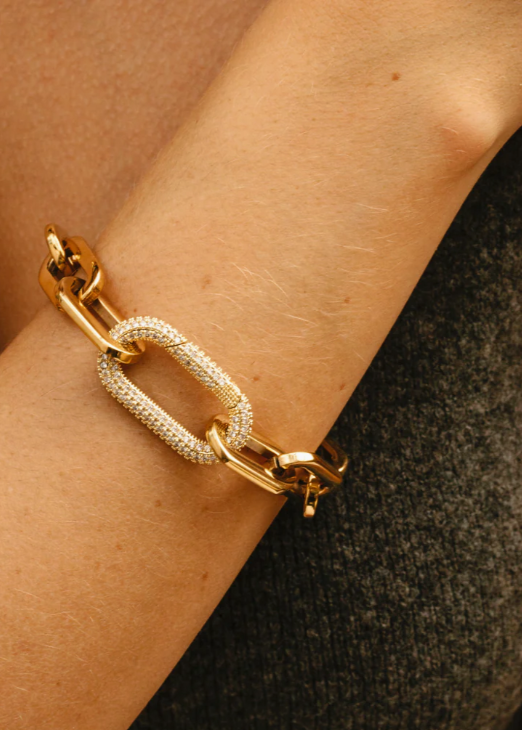 This 8-inch bracelet features a stainless steel base plated with 18k gold, adorned with micro pave zirconia stones and a carabiner clasp for sophisticated durability.