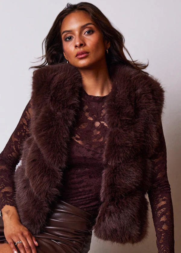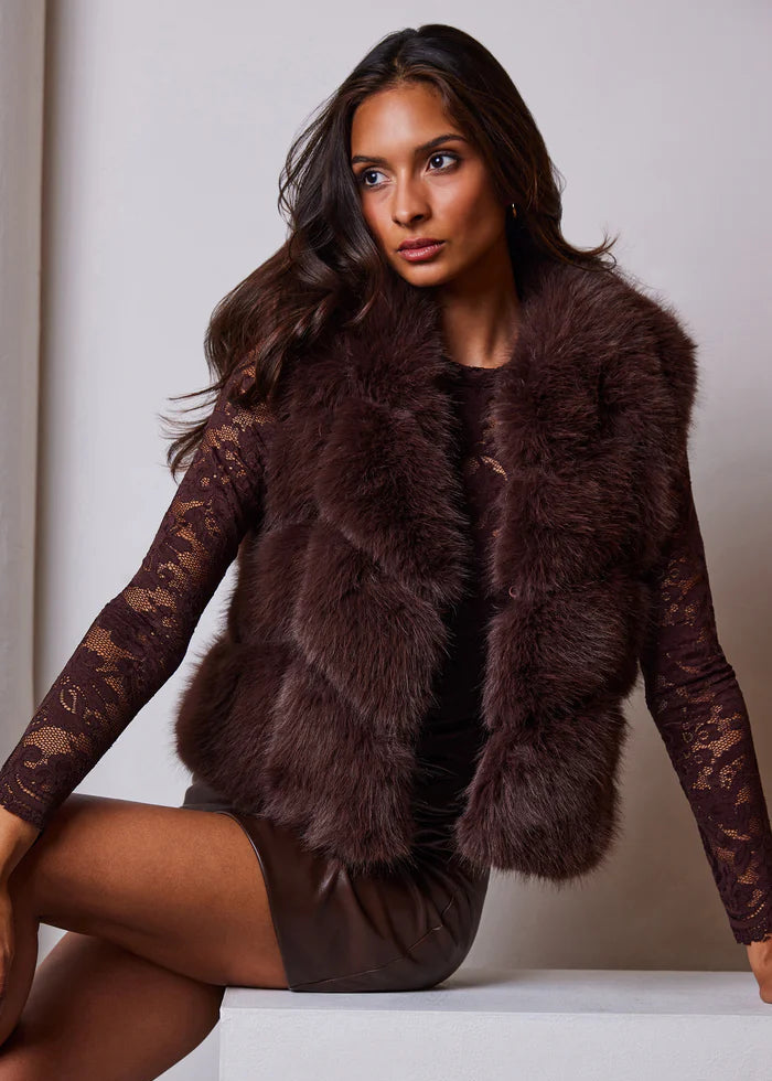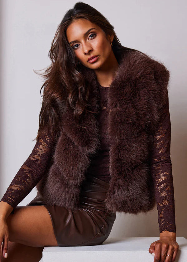 The Rosario Vest delivers sophisticated warmth with a plush faux fur finish in deep chocolate brown. Designed with a high-neck and chevron panel details, it offers a textured, upscale appearance. Its cropped cut provides a contemporary flair, perfect for layering over sweaters, shirts, or leather pieces.