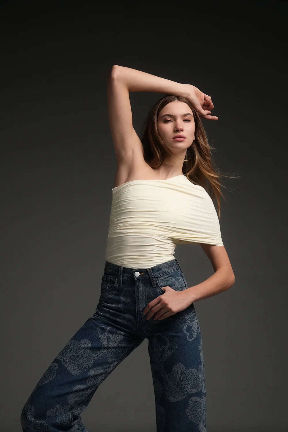 A sleek one-shoulder red bodysuit designed with soft, figure-hugging ruching for a modern, sculpted silhouette.