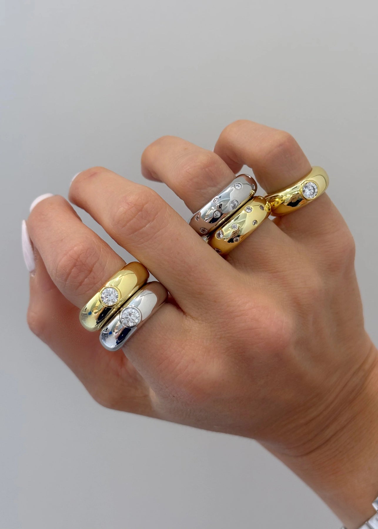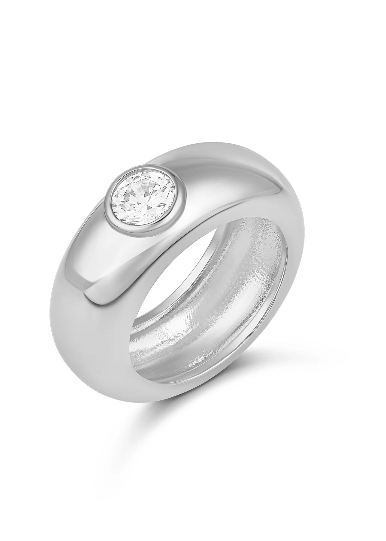 This striking ring effortlessly elevates your look with its subtle sparkle, perfect for enhancing any ensemble quickly. Crafted with 18k gold plating over brass or sterling silver, it features a white cubic zirconia stone set in a 5 mm center bezel. The ring measures 7 mm thick and is available in size 6.