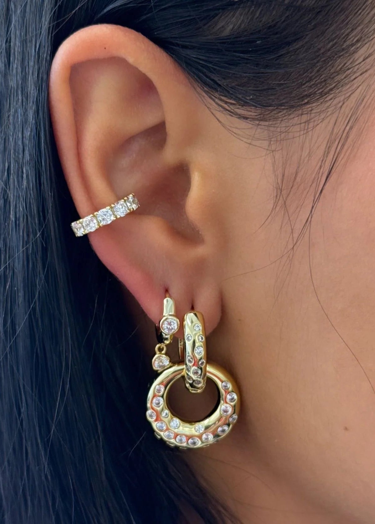 These bold gold hoops feature a chic donut-drop design, enhanced by scattered white stones that shimmer with every movement. Combining sleek circular shapes with sparkling accents, these earrings deliver a modern elegance suitable for both daytime and evening wear. Crafted with 18k gold plating over brass and adorned with white cubic zirconia, the hoops measure 8 mm, while the donut drop extends 20 mm for a striking yet refined look.