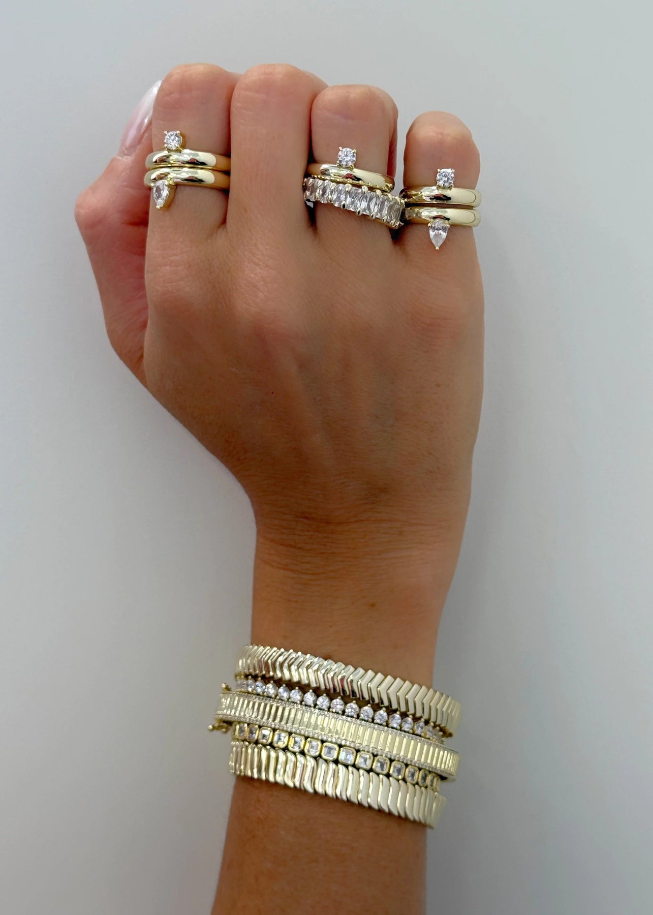 This gold eternity band commands attention with its continuous row of sparkling oval and emerald-cut stones, delivering a striking, high-gloss finish visible from every perspective. Perfect for layering or wearing alone, it makes a sophisticated and bold style statement. Crafted with 18k gold plating over brass, featuring white cubic zirconia, and a 6mm band width.