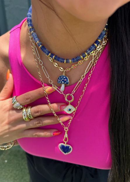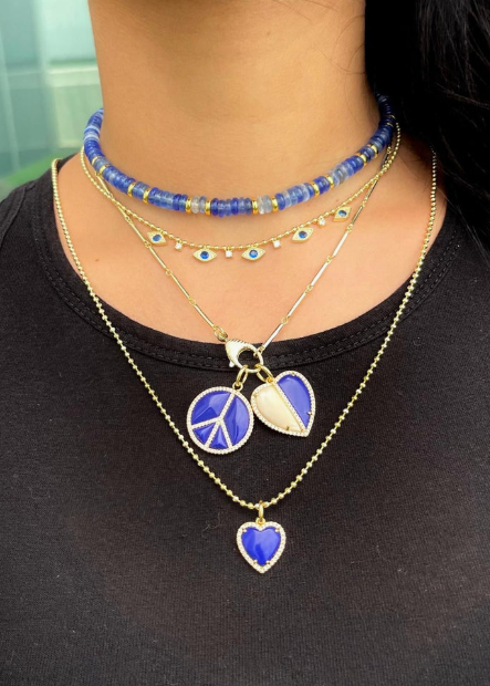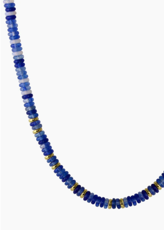 This subtle necklace evokes a laid-back, beach-inspired style with a bohemian flair. Perfect for mixing with elegant accessories to create an effortless, chic look. Features include 18k gold plating over brass, a navy and white pukka design, gold disk accents, and a 13.5-inch length with a 4.5-inch extension chain.