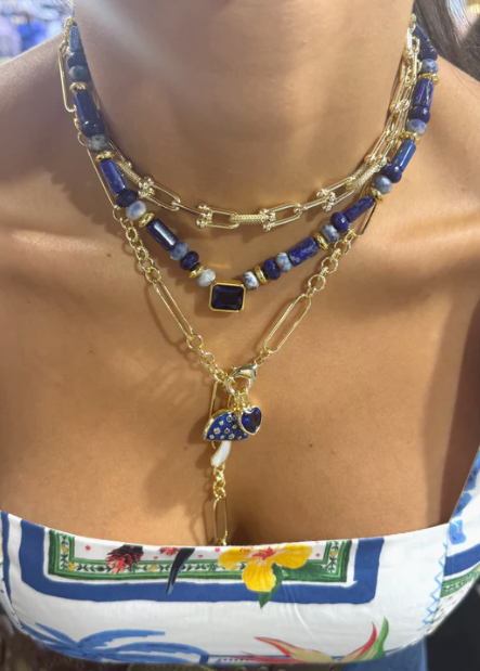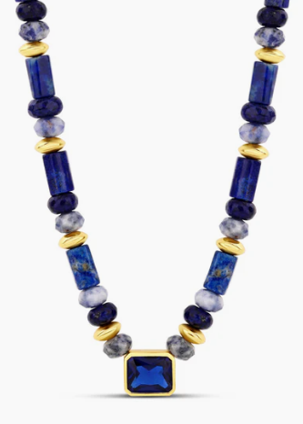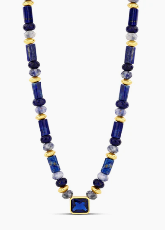 This refined necklace showcases a compelling blend of deep blue cylindrical beads, faceted stones, and luxurious golden highlights. Its standout feature is a bold square-cut blue centerpiece that harmonizes color and texture with elegance. Designed to elevate any ensemble, it seamlessly transitions from casual daywear to evening sophistication. Crafted with 18k gold plating over brass, it includes natural stones that may vary in hue and shape, a pink cubic zirconia center stone, and a 12 mm middle stone. The length measures 14 inches with an additional 4-inch extension for adjustable wear.