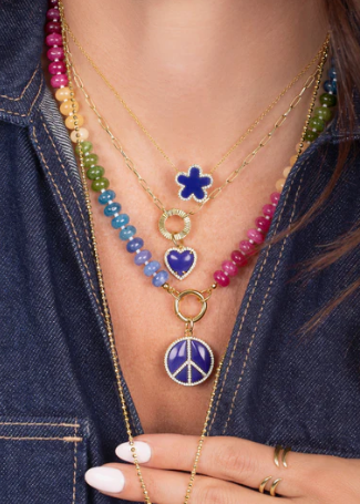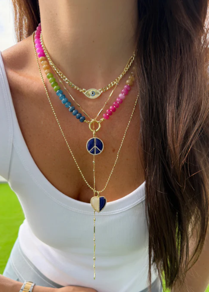 This necklace features natural color stones and measures 16 inches in length with an additional 2.5-inch extension. It is secured by a 15 mm push clasp, which also allows for charms to be attached at the center.