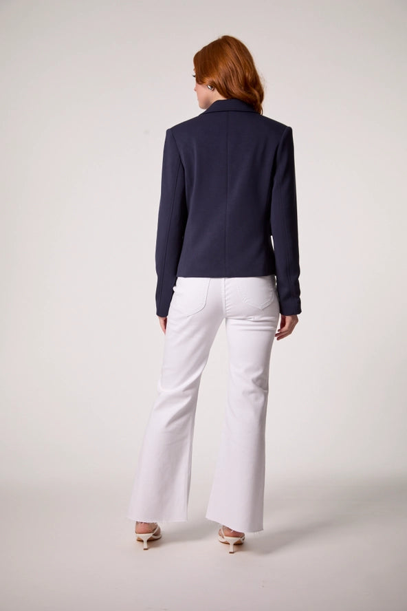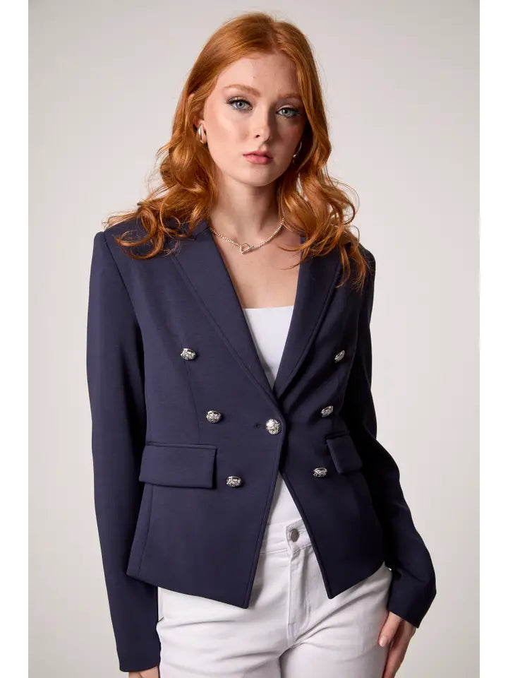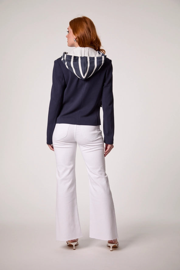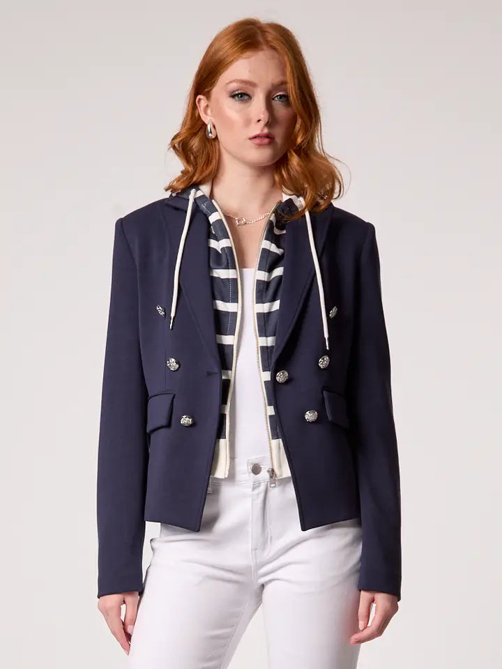 Elevate your wardrobe with the Kasey Nautical Hooded Blazer—a sophisticated fusion of coastal elegance and contemporary edge. This navy blue revival piece features impeccable tailoring, a removable striped hoodie for effortless layering, polished silver buttons, and functional front flap pockets. Quintessentially Hamptons-inspired yet undeniably modern, it transitions seamlessly from boardroom to weekend getaway. A boutique essential for the discerning dresser.