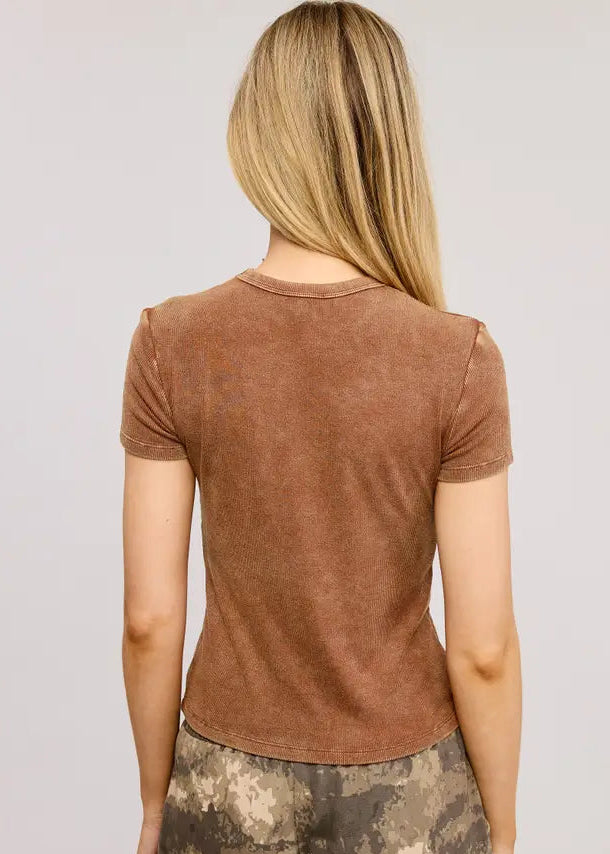 A timeless women's essential featuring ribbed knit construction with a crew neckline and short sleeves. The seamless design offers a refined fit, while the garment-dye process creates unique color variations in each piece. Versatile year-round styling staple.