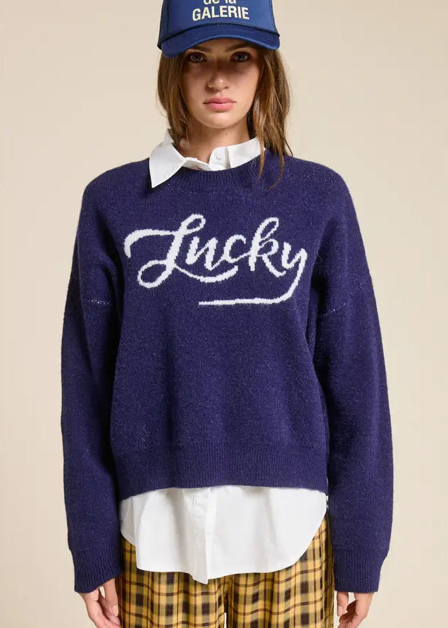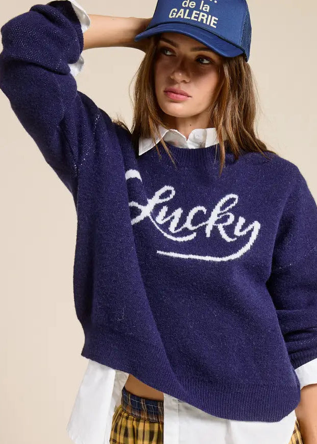 The Mimosa sweater combines comfort with contemporary styling through its sumptuous knit texture and intentional oversized fit. Featuring dropped shoulders and reinforced ribbed edges, this crewneck long sleeve offers structural refinement while maintaining an effortlessly relaxed aesthetic. The prominent "Lucky" graphic anchors the design with character. Its generous proportions make it equally suited for solo wear on casual occasions or as a layering piece over button-ups, providing styling flexibility for various occasions.