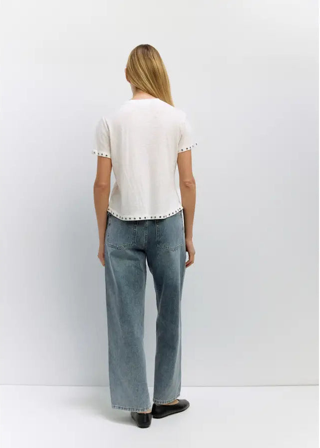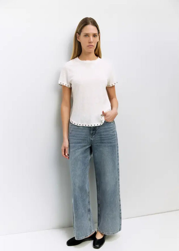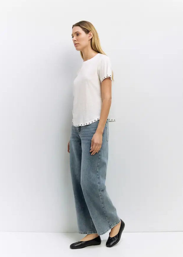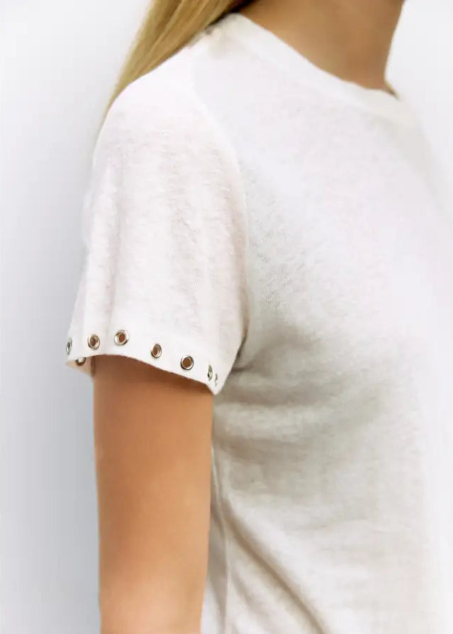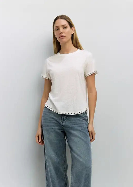 The Zoey Top combines effortless style with thoughtful design details. Crafted from lightweight slub linen-cotton jersey, this relaxed-fit tee feels soft and breathable against your skin. Signature rivet accents along the short sleeves and hem add an understated modern touch to the timeless crewneck silhouette. Perfect for layering or wearing solo, it's a versatile wardrobe essential that transitions seamlessly from casual days to weekend outings.