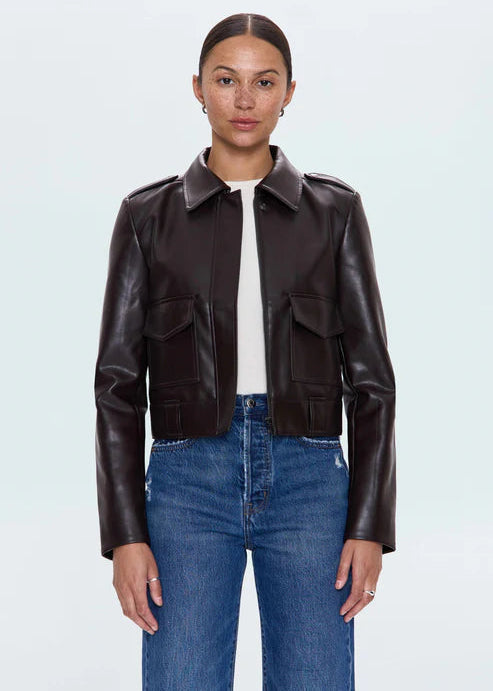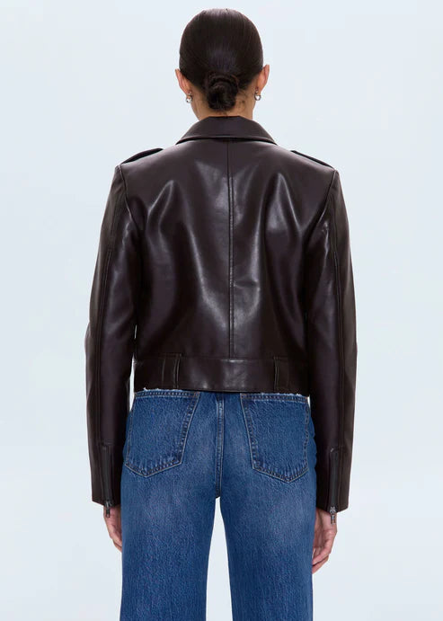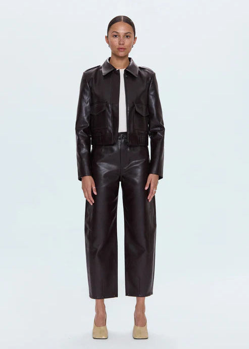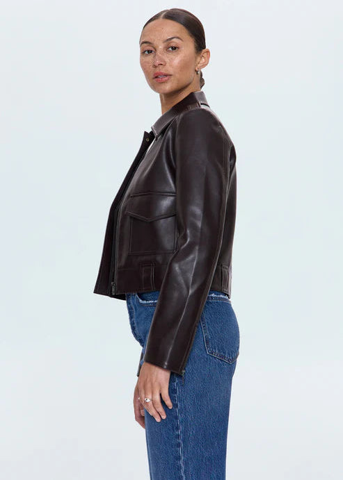 Bex reimagines the timeless leather jacket through contemporary tailoring—a cropped silhouette that balances attitude with refined proportion. Constructed from supple alternative leather in French Roast, a luxurious deep brown with subtle luminosity, this piece features a structured collar, functional front flap pockets, and minimalist detailing. The result is a jacket that reads sophisticated yet undeniably cool, offering the visual impact of classic leather styling without unnecessary weight.