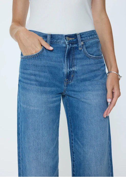 The Donny redefines the boyfriend silhouette with its elevated proportions and refined construction. A high-rise waistband pairs with a generously relaxed fit through the hips and thighs, transitioning into a gracefully widened leg that's anchored by a signature double rolled hem. The light indigo wash showcases authentic fading and whiskering details that evoke an effortlessly worn-in aesthetic, making this jean a versatile foundation for contemporary styling.