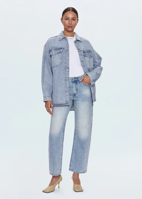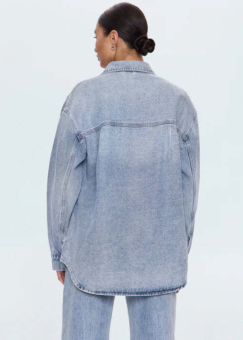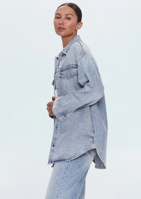 Channeling menswear aesthetics with contemporary attitude, this denim shacket delivers effortless versatility. The relaxed silhouette features dropped shoulders and elongated sleeves that enhance its oversized proportions, while functional four-pocket construction keeps it practical. Wear it buttoned for structure or layered for dimension, either way, it's a wardrobe workhorse. For a more tailored, feminine shape, sizing down is recommended.
