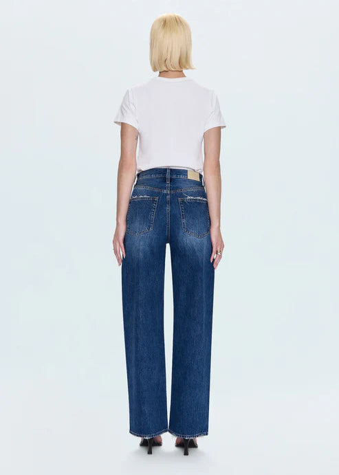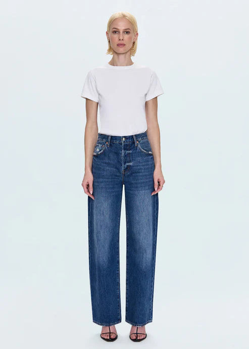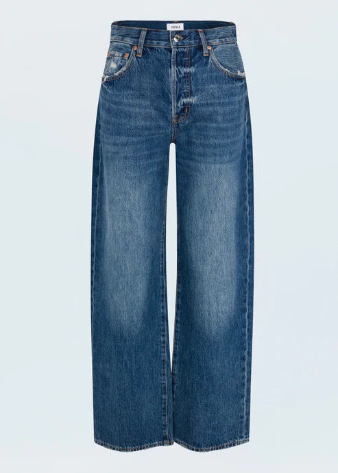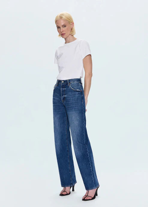 Blue denim perfected. The Tate features a high-rise design paired with our distinctive bowed wide leg and a full 32" inseam, offering a fresh take on denim sophistication. This modern silhouette enhances the classic five-pocket design with a gentle leg curve that adds depth, while the wide leg opening introduces contemporary balance. Made from 100% cotton non-stretch Fulton denim in a timeless blue wash, this style combines enduring appeal with modern refinement.