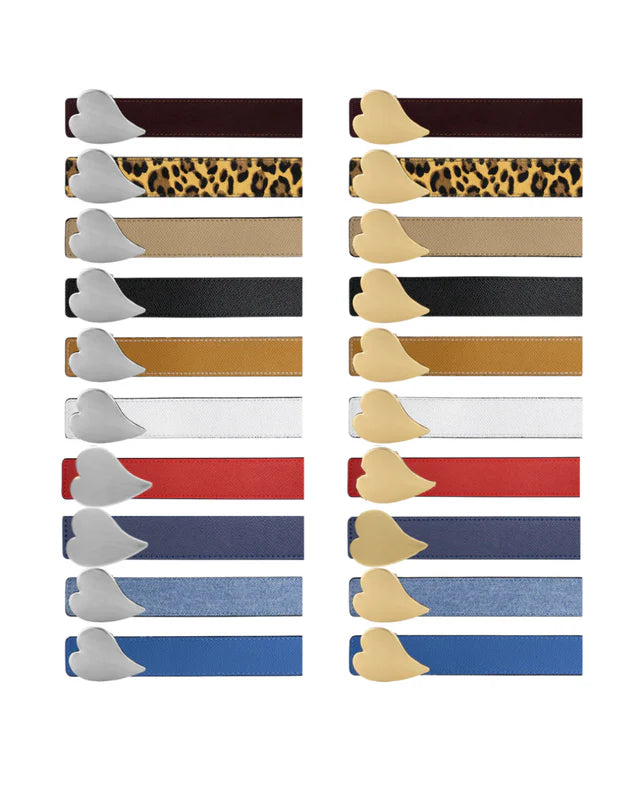 Discover the MB HEART Belt—a distinctive accessory designed by Meredith that defies convention. This free-form, sideways-sitting belt combines timeless elegance with unexpected flair, offering a design you won't find anywhere else. Crafted from 100% grain leather and genuine calf hair, it features a removable gold or silver brushed buckle and comes in five reversible colorways. At 1.25" wide with a 3" x 1.5" buckle, it transitions seamlessly from hip to waist wear. Each belt arrives in an MB Custom Dust Bag. A true closet essential that balances quality materials with thoughtful, on-trend details—perfect for those who embrace individuality.