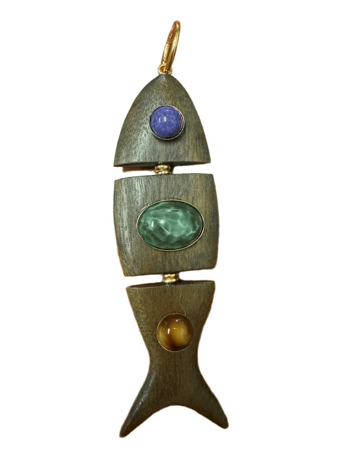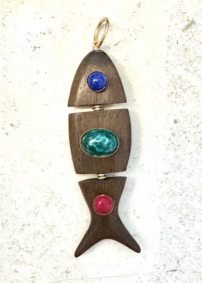 Discover the artisanal craftsmanship of Viviane Guenoun's Wooden Fish Charm, where natural wood meets crystalline elegance. Each pendant is individually carved and hand-polished, creating a distinctive piece with its own character and grain pattern. Adorned with gleaming crystals, this charm embodies timeless symbolism—representing prosperity, creativity, and harmonious movement. The organic warmth of sustainably sourced wood pairs seamlessly with refined gemstone accents, making it equally striking as a standalone pendant or layered charm. At approximately 10 cm, this limited-edition design celebrates the philosophy that true luxury lies in authenticity and individuality. Every creation is singular, never to be replicated, ensuring you own a genuinely exclusive work of wearable art.