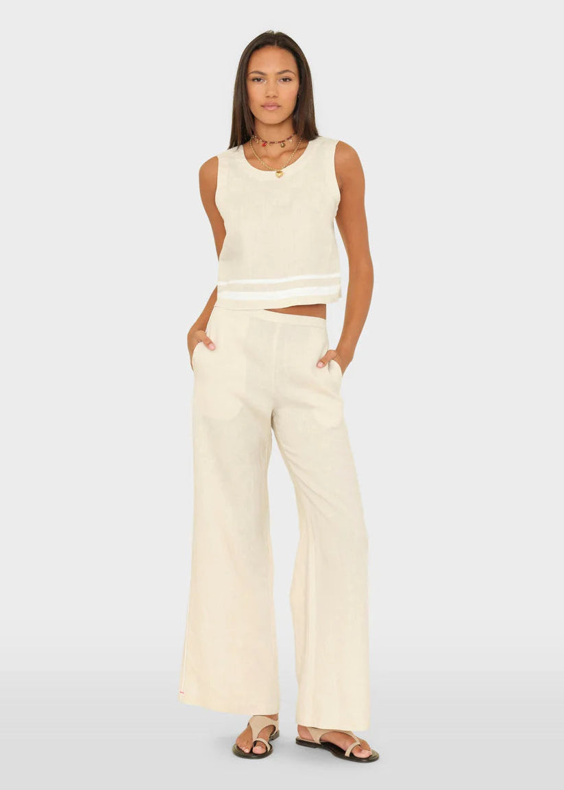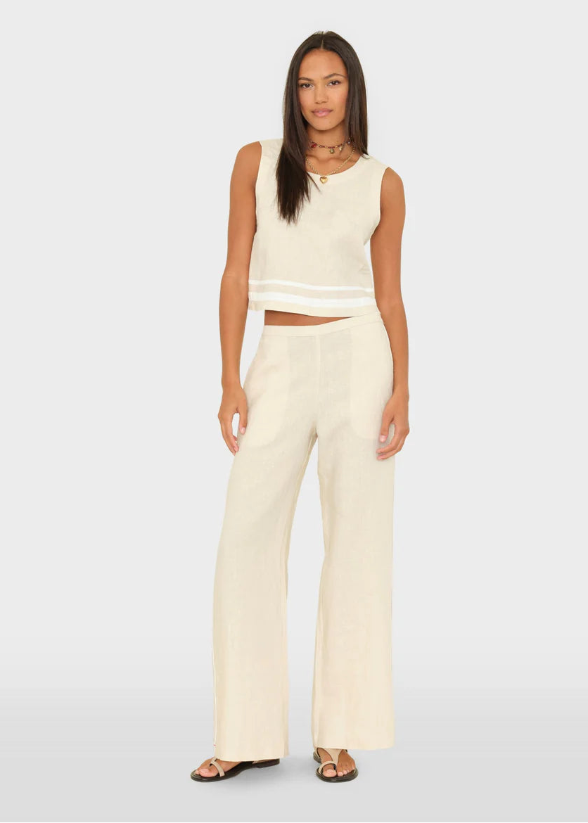 Embrace effortless elegance with the Xirena Winds Pippen Pant, crafted from breathable lightweight linen for warm-weather comfort. This relaxed wide-leg silhouette features a forgiving elasticized waist, functional side seam pockets, and refined contrast piping detailing that elevates the understated design. Perfect for transitioning from resort to everyday wear.